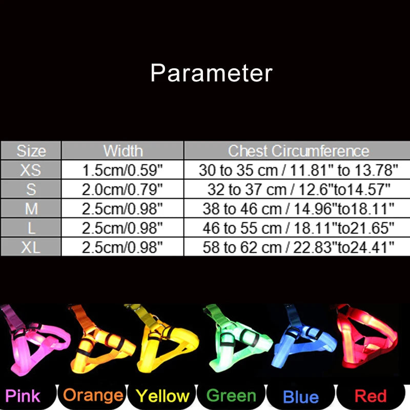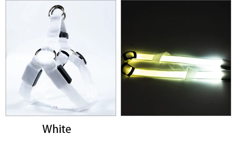 Un arnés práctico y seguro que combina estilo, comodidad y protección, ideal para mantener a tu perro visible durante los paseos nocturnos.